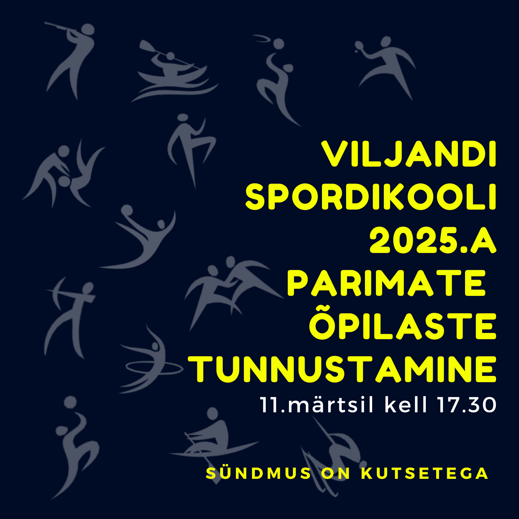 Viljandi linn pakub peredele huvikoolide õppetasu soodustust Loomise kuupäev 11.01.2026 Autor Viljandi Spordikool Head uut aastat Loomise kuupäev 01.01.2026 Autor Viljandi Spordikool Maadlusosakonna treeningud Loomise kuupäev 09.09.2025 Autor Viljandi Spordikool Avatud treeningud tulevad taas! Loomise kuupäev 22.08.2025 Autor Viljandi Spordikool Vaata rohkem
