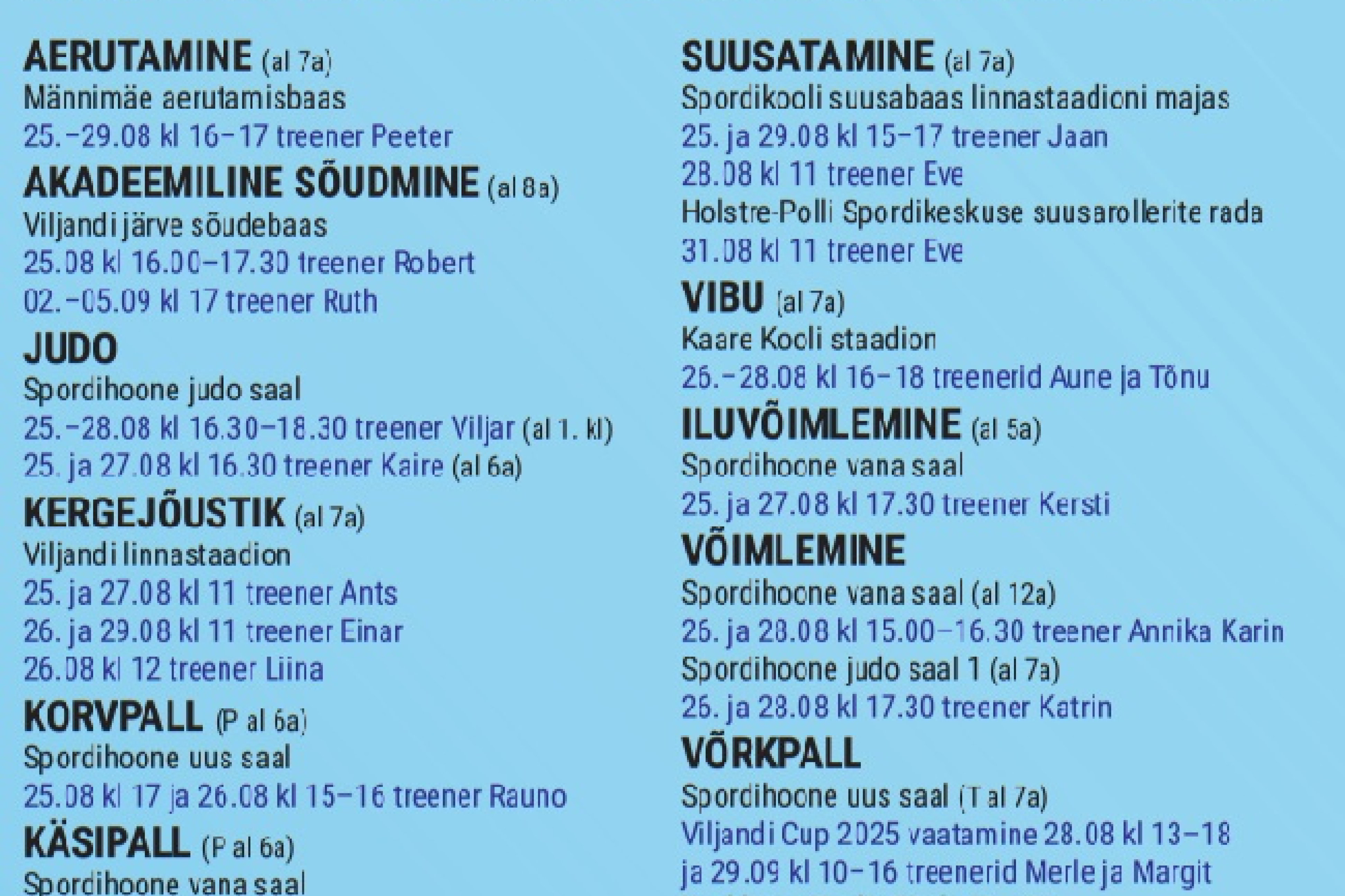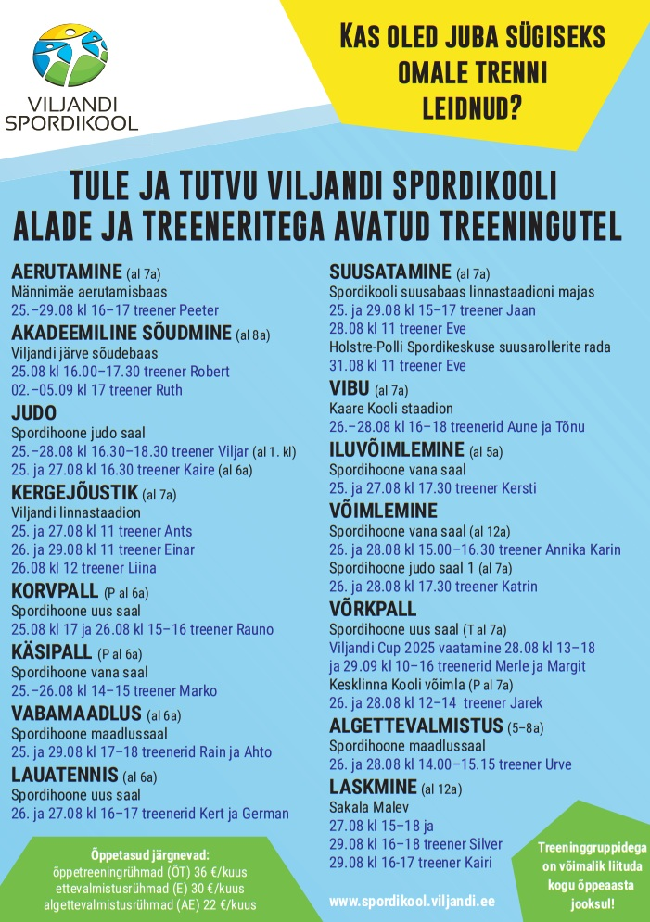 KERGEJÕUSTIK Viljandi linnastaadion | al 7.a | Treener Liina | 26.08 kl 12 |