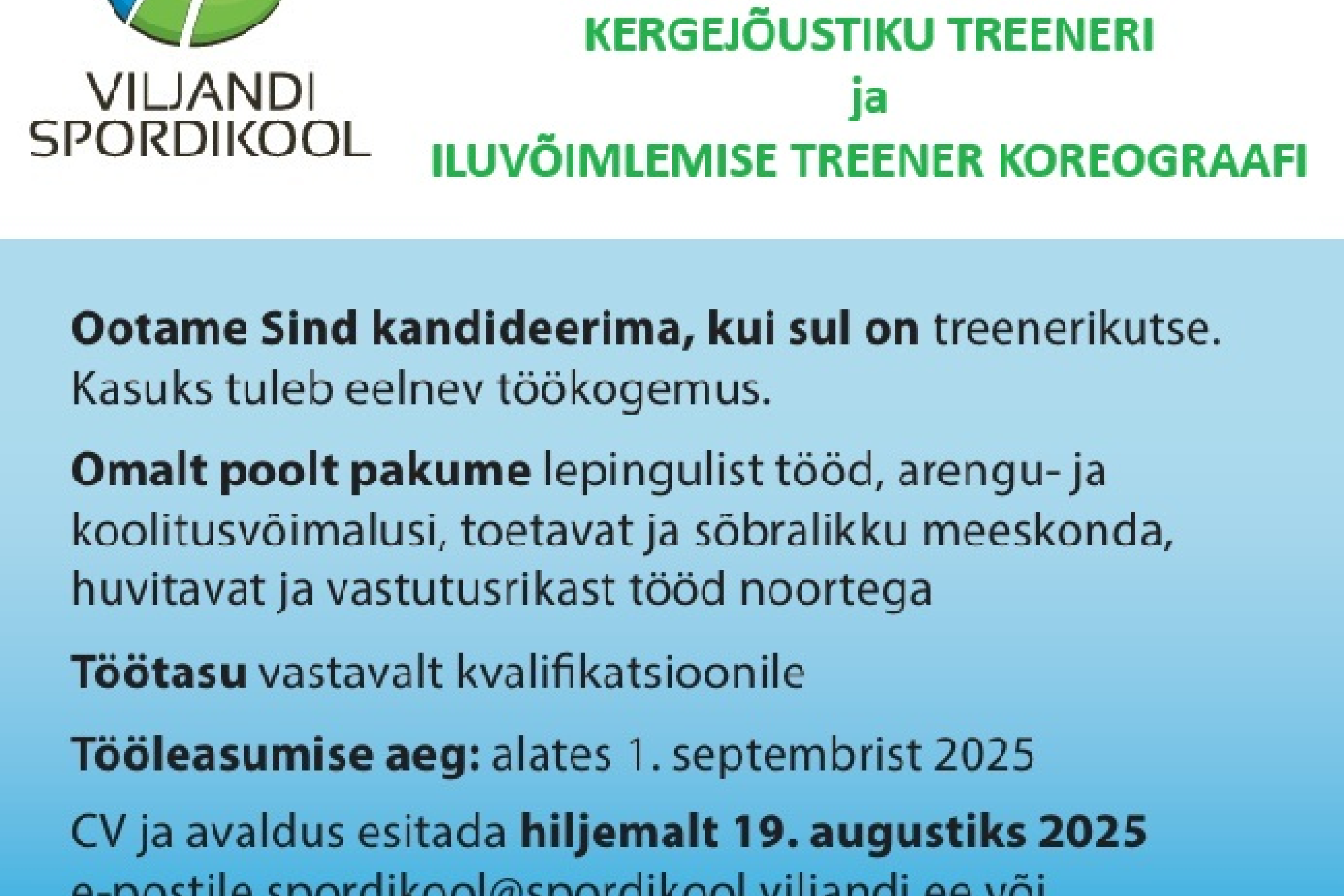 Viljandi Spordikool võtab tööle KERGEJÕUSTIKU TREENERI osalise tööajaga ja ILUVÕIMLEMISE TREENER-KOREOGRAAFI osalise tööajaga