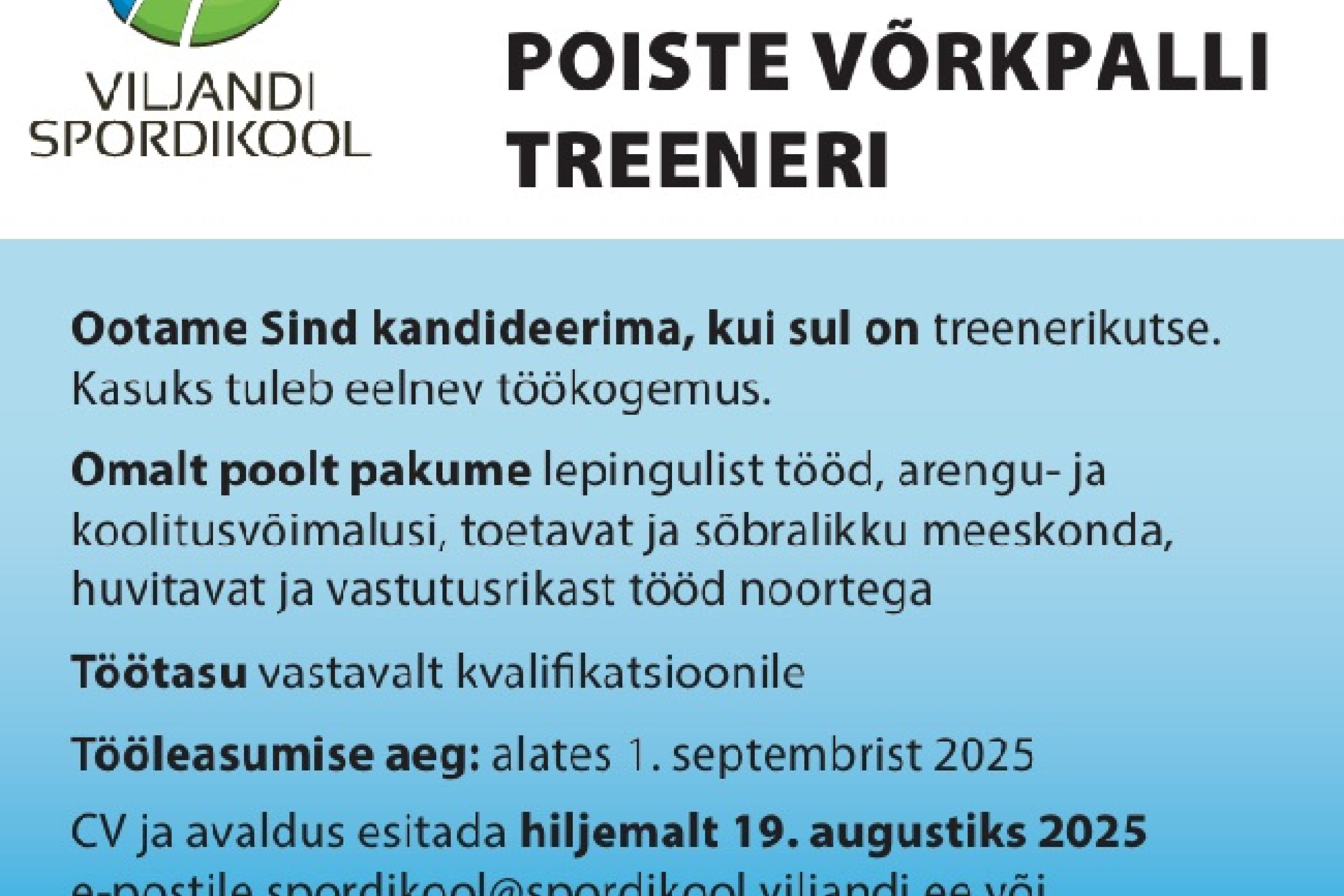 CV ja avaldus esitada hiljemalt 19. augustiks 2025 e-postile spordikool@spordikool.viljandi.ee või aadressil Vaksali 4, 71020 Viljandi