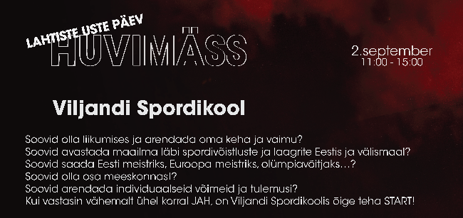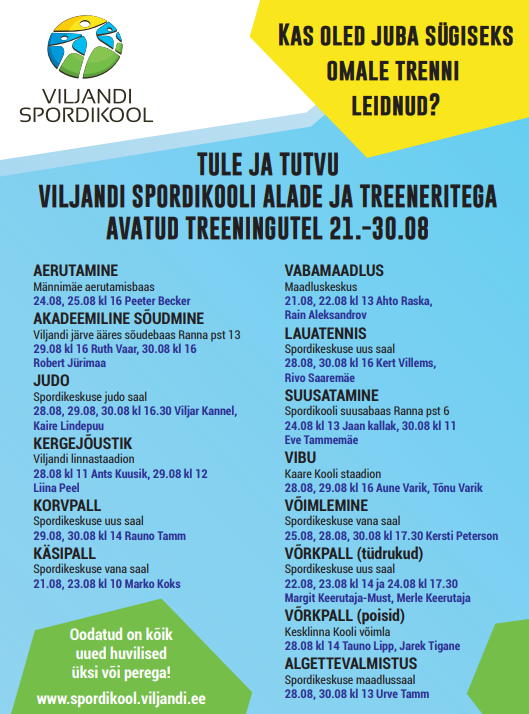 2. septembril jagame üldist infot spordikooli treeningute kohta. Kergejõustiku treener Einar Kaigas ootab huvilisi Viljandi Linnastaadionil kell 12.30-13.00 TREENERITE ja...